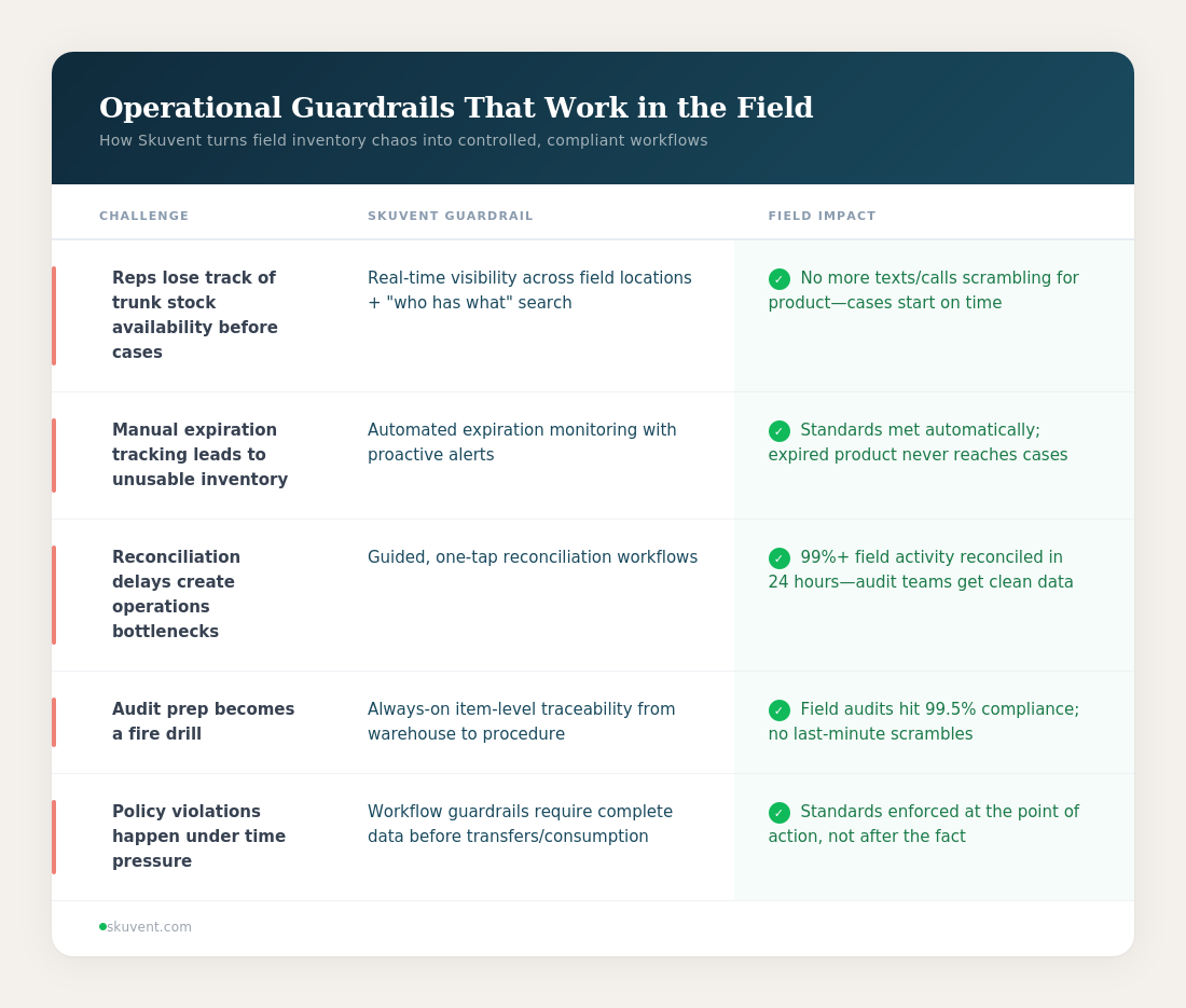 Skuvent doesn't just track inventory—it enforces field operations standards so effortlessly that operational compliance feels like the natural way of working. Reps stay in flow, operations scales smoothly, and patient safety becomes a system strength, not a checklist item.